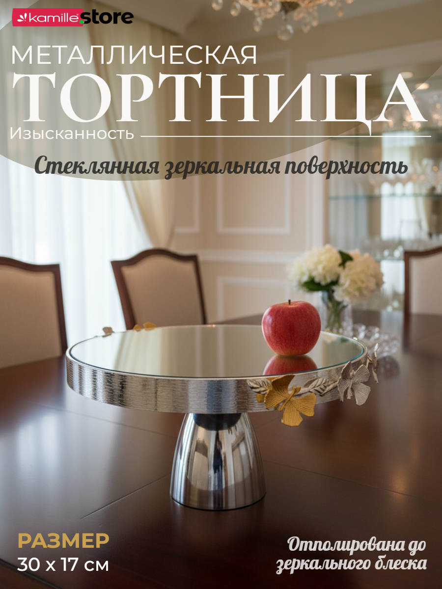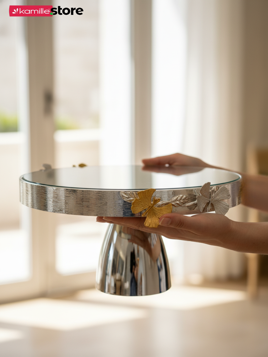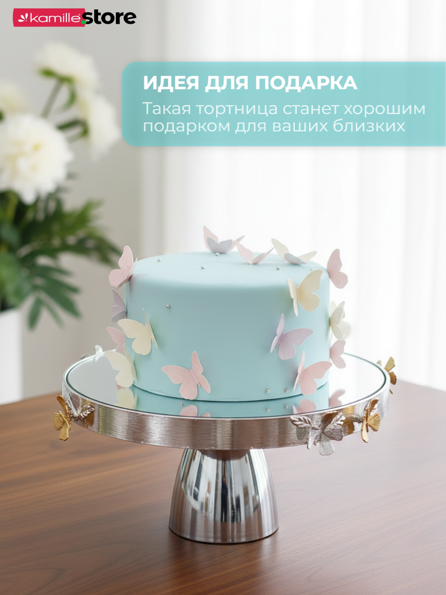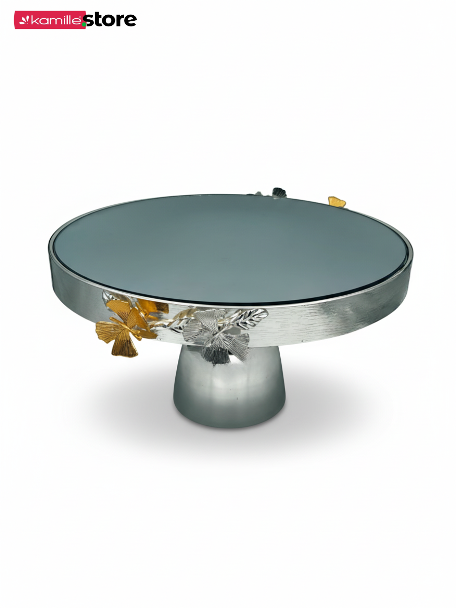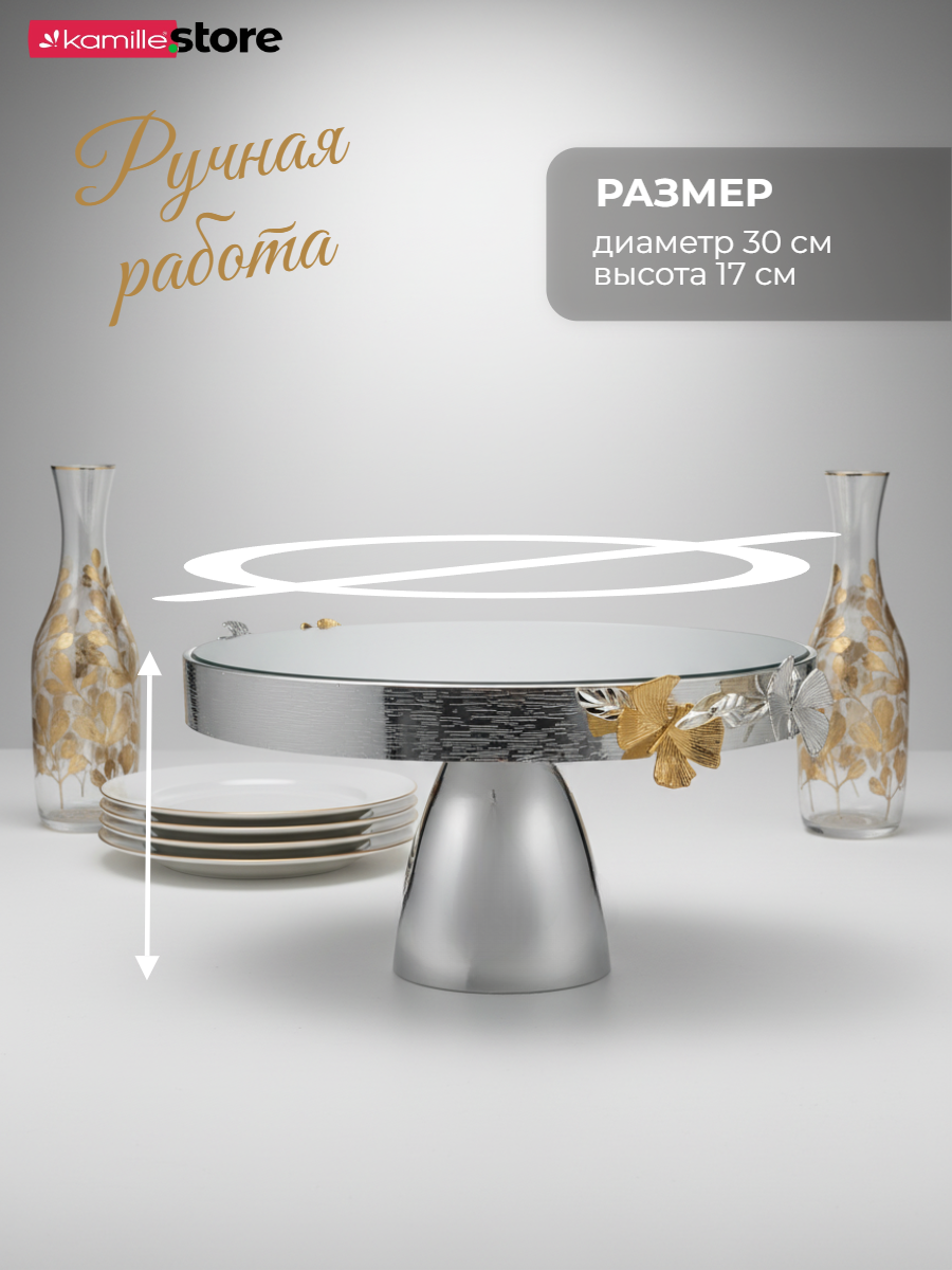 Представляем вашему вниманию стильную и яркую, притягивающую взгляд - металлическую тортницу на ножке - зеркальная полировка металла, стеклянная зеркальная поверхность, аккуратный декор в виде бабочек в двух цветах - серебристом и золотистом, гарантированно никого не оставят равнодушными. Блюдо универсальное, хорошо подойдет для сервировки и подачи тортов или пирогов, десертов и выпечки. Такая посуда создана для того, чтобы добавить изысканности вашему интерьеру и придать уютной обстановке штрих оригинальности.