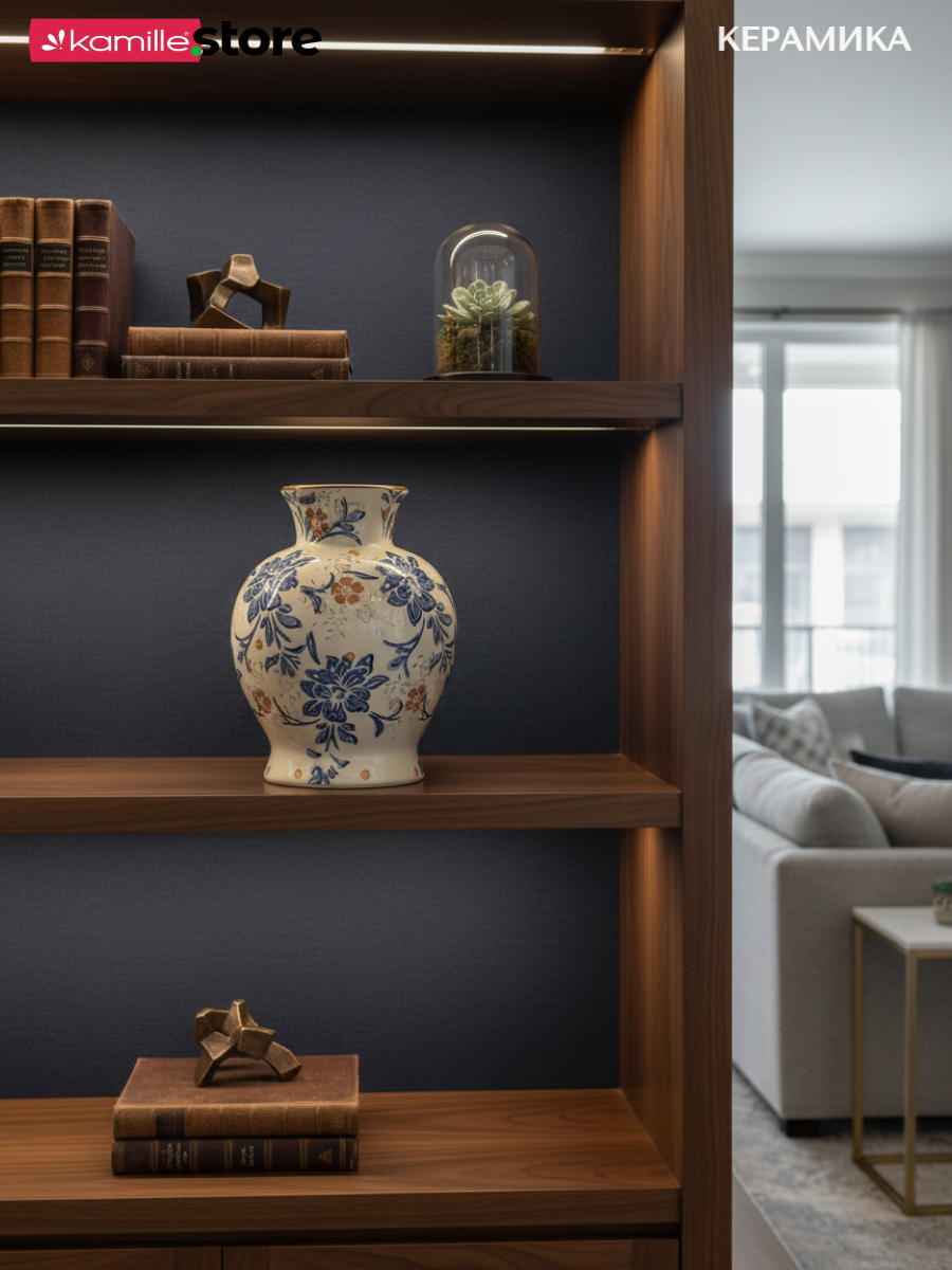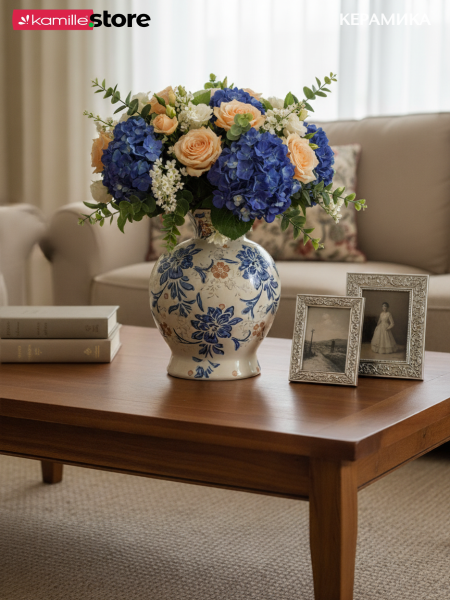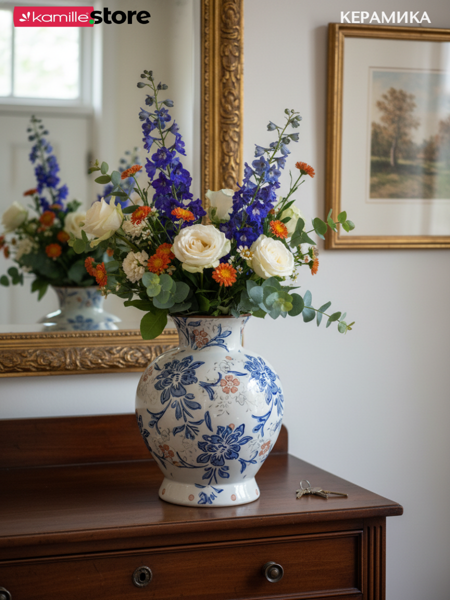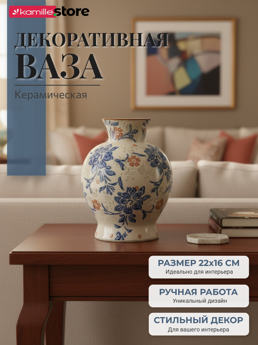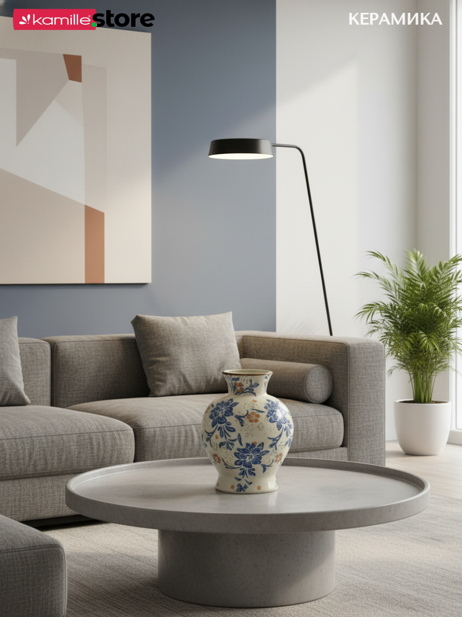 Перед Вами невероятно эффектная и в тоже время сдержанная керамическая ваза. Круглая форма, флористический узор, глянцевое глазурованное покрытие, все это делает предмет живым и интересным выделяя его среди подобных моделей.