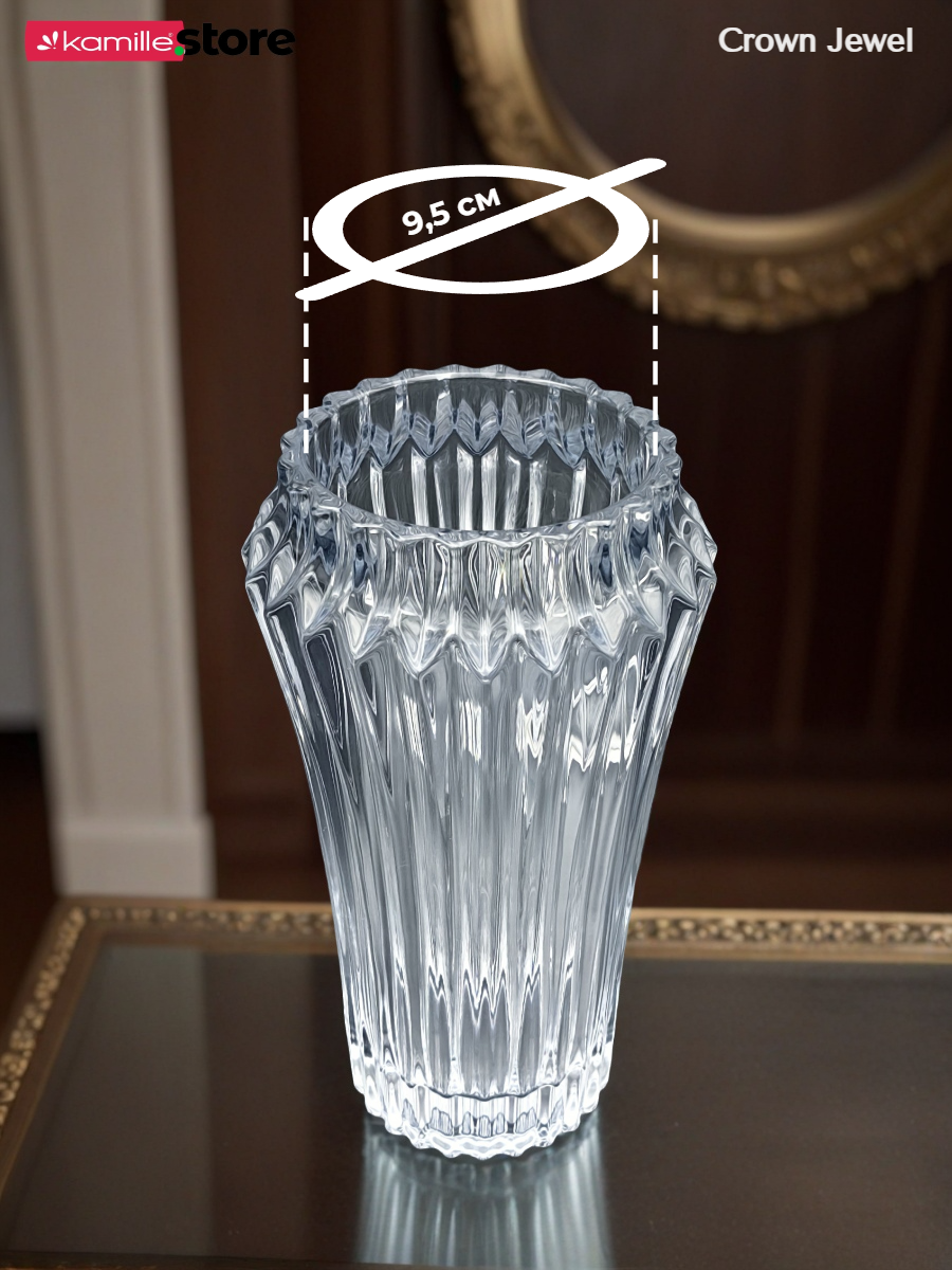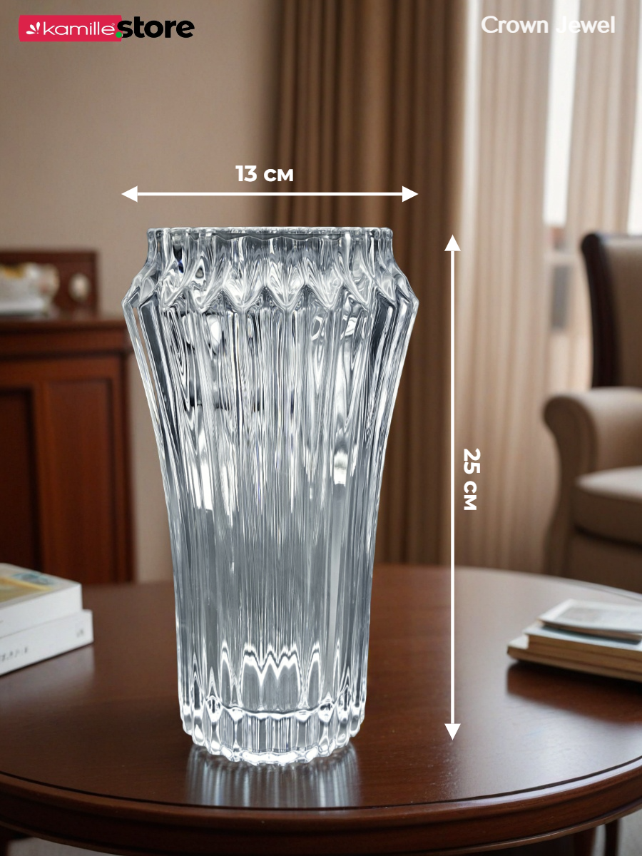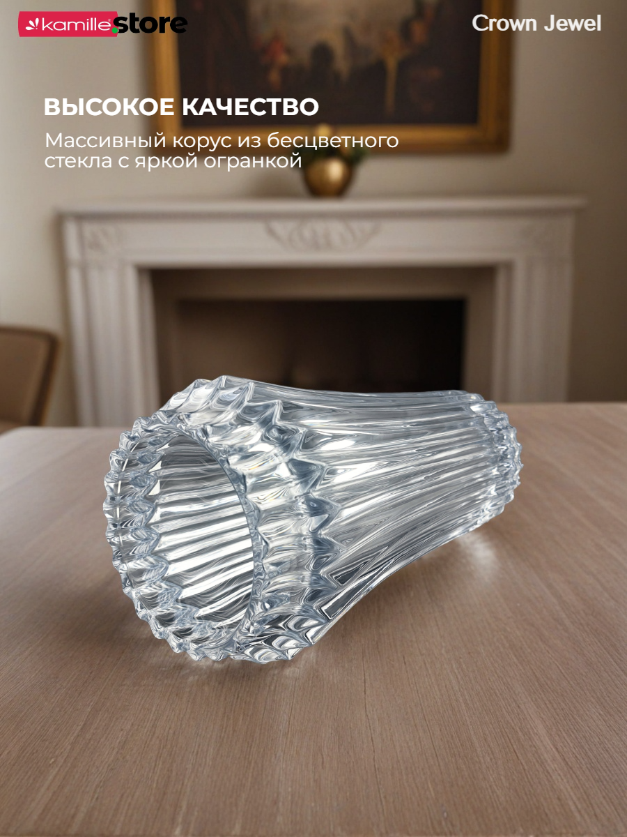 Перед Вами невероятно эффектная стеклянная ваза - массивный корпус из бесцветного стекла, рельефная круглая форма, ваза тяжелая и устойчивая, такой предмет займет достойное место в вашем интерьере или в интерьере ваших близких, она будет не просто дополнением, а станет ярким акцентом и подойдет для абсолютно любого букета живых или искусственных цветов, или сухоцветов.