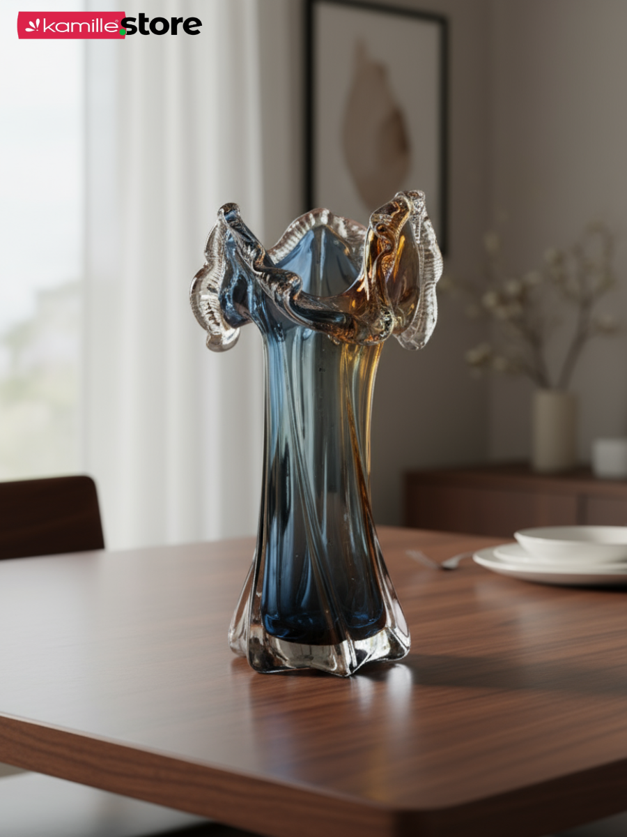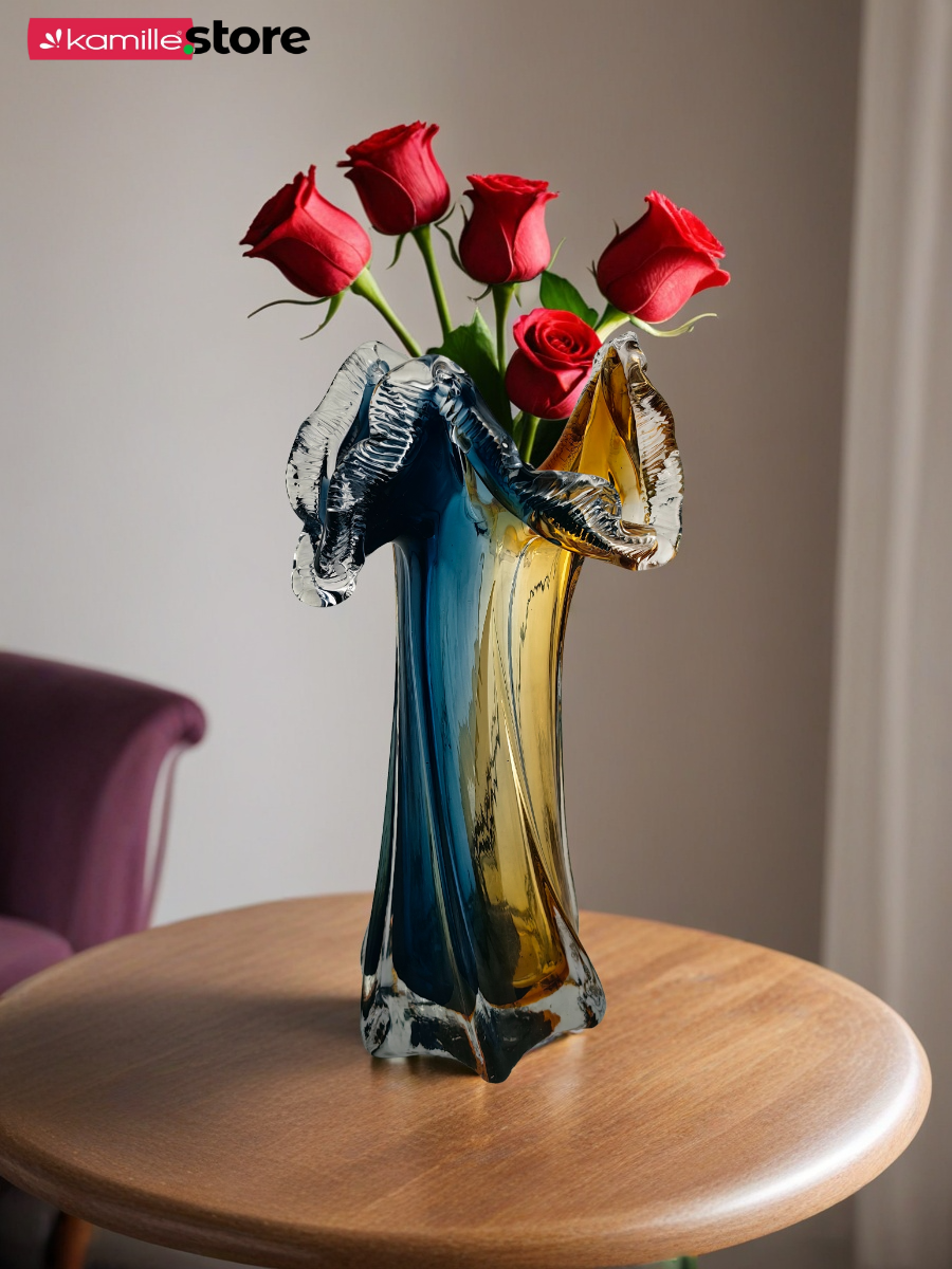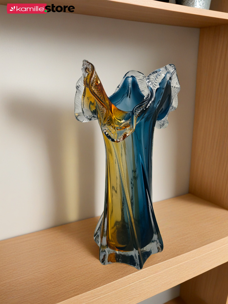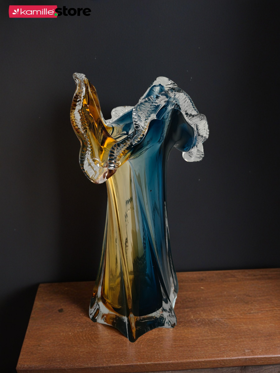 Перед Вами невероятно яркая и эффектная стеклянная ваза. Красивая рельефная форма с горлышком в виде морской волны, стекло с переливом - все это делает предмет живым и интересным выделяя его среди подобных моделей.