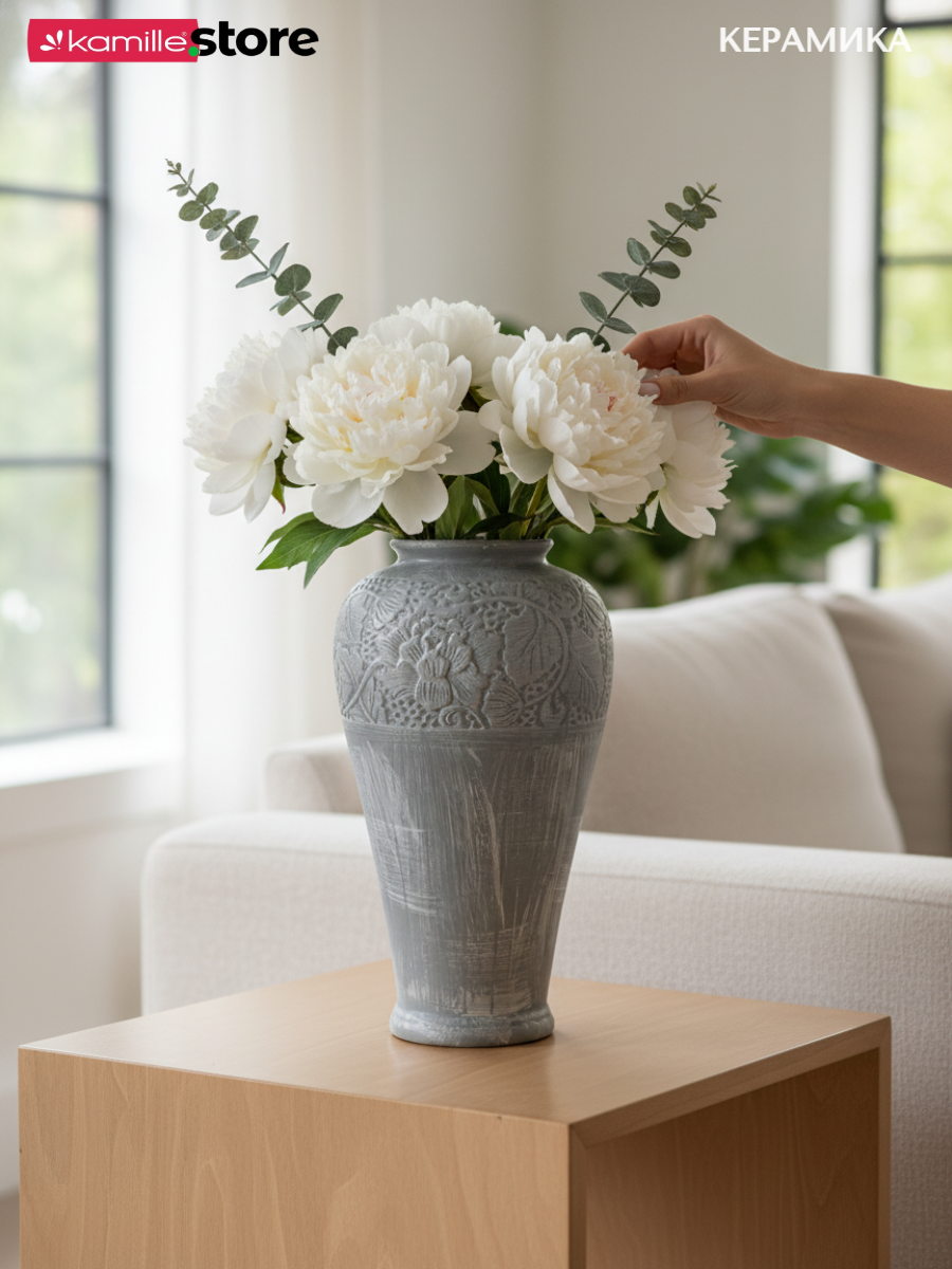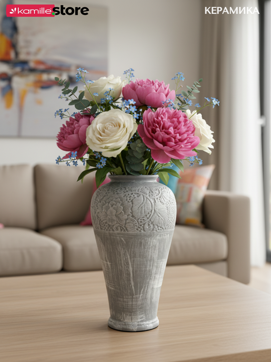 Перед Вами невероятно эффектная и в тоже время сдержанная керамическая ваза. Округлая форма, рельефные неровности стенок, матовый серый цвет, все это делает предмет живым и интересным выделяя его среди подобных моделей.