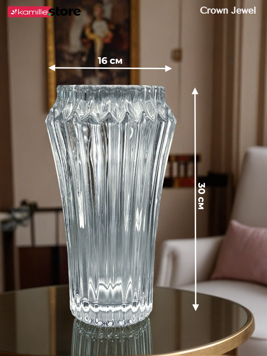 Материал: бесцветное стекло. Ширина: 16 см. Высота: 30 см. Комплектация: ваза 1 шт. Упаковка: цветная картонная коробка. Ящик: 6 шт.