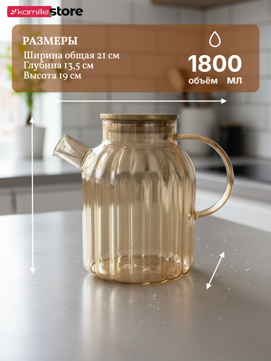 Материал чайника: термостойкое боросиликатное стекло. Материал крышки: нержавеющая сталь, с силиконовым уплотнителем. Материал ручки: стекло. Объем: 1800 мл. Фильтр: есть, в носике. Материал фильтра: нержавеющая сталь. Подходит для мытья в посудомоечной машине: только корпус.  Упаковка: цветная картонная коробка. Ящик: 24 шт.