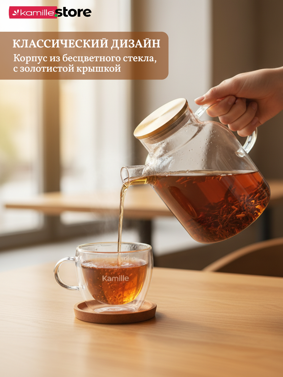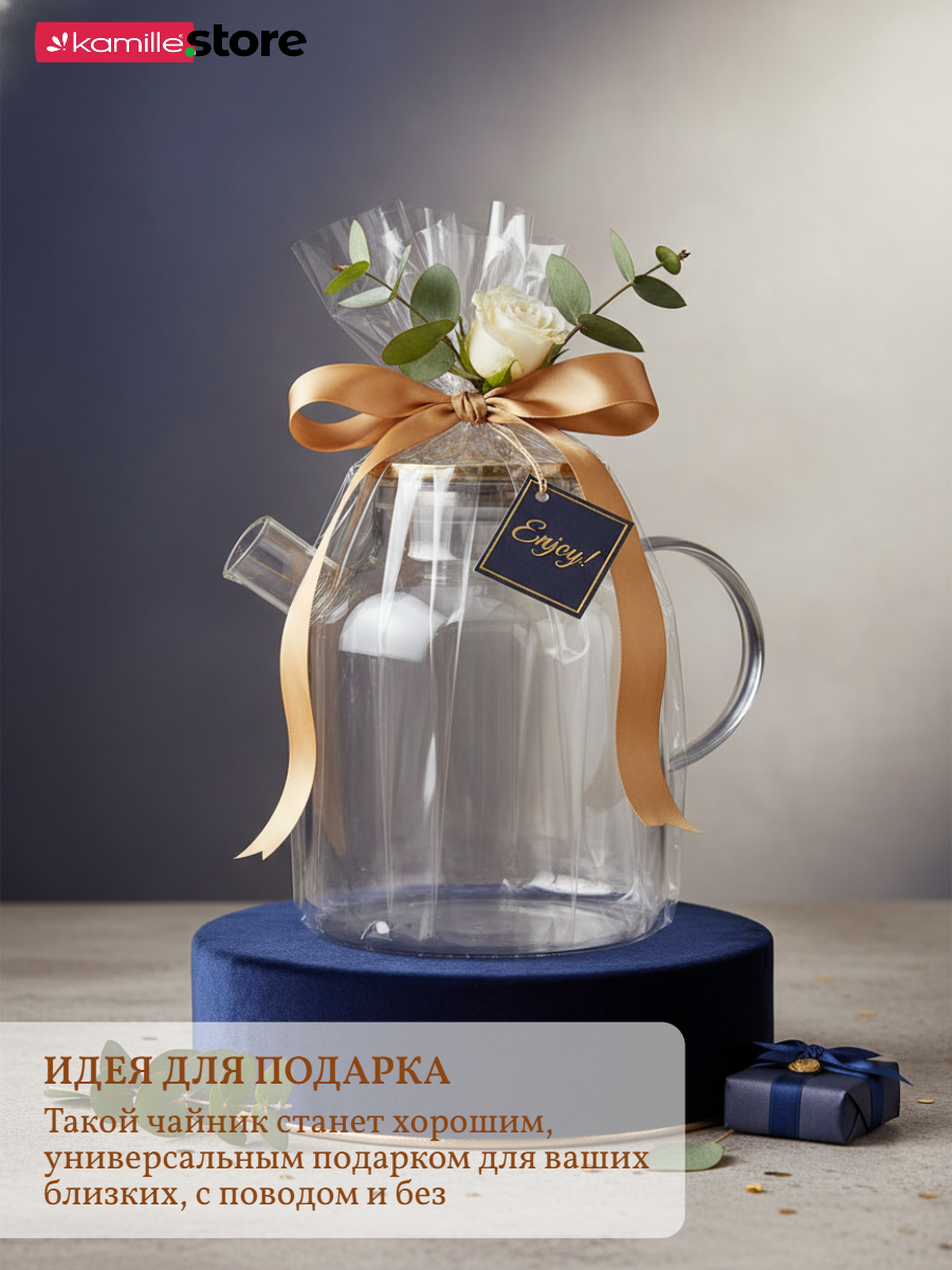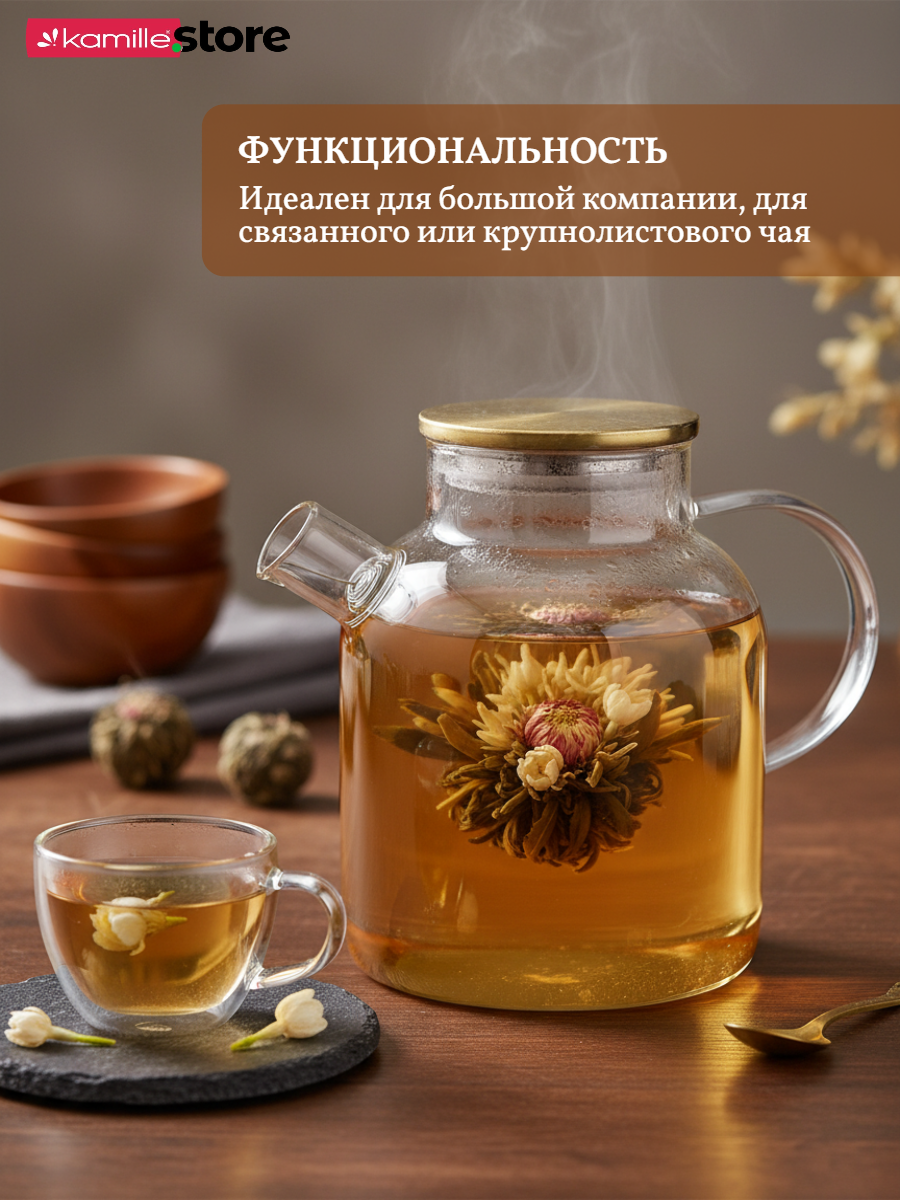 Стеклянный заварочный чайник с фильтром-пружинкой в носике, можно использовать для лиственного, травяного и фруктового чая. Особенно эффектно в таком чайнике будет выглядеть "Связанный чай", шарик которого при заваривании раскрывается в букет. Крышка изготовлена из из нержавеющей стали, с силиконовым уплотнителем.