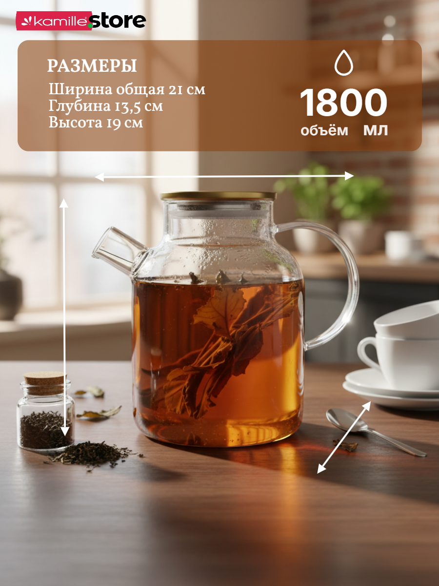 Материал чайника: термостойкое боросиликатное стекло. Материал крышки: нержавеющая сталь, с силиконовым уплотнителем. Материал ручки: стекло. Объем: 1800 мл. Фильтр: есть, в носике. Материал фильтра: нержавеющая сталь. Подходит для мытья в посудомоечной машине: только корпус.  Упаковка: цветная картонная коробка. Ящик: 24 шт.